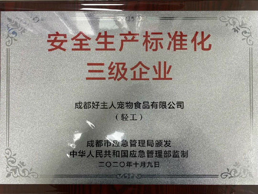 近日,成都好主人寵物食品有限公司榮獲由成都市應急管理局頒發(fā)的全生產(chǎn)標準化三級企業(yè)證書。