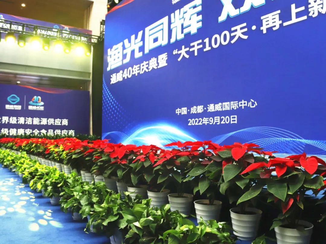 期間,隨處可見的通威40年主題元素裝置、展現(xiàn)通威發(fā)展的時光隧道、一盆盆鮮艷多姿的景觀花卉,將大會現(xiàn)場裝扮一新。通威藍與喜慶紅,交相輝映,現(xiàn)場處處洋溢著喜慶氛圍,熱情迎接各位領(lǐng)導(dǎo)嘉賓,共慶通威40年華誕。