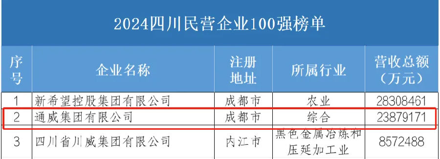 10月29日,四川省工商聯(lián)發(fā)布“2024四川民營企業(yè)100強”榜單和《2024四川民營企業(yè)100強調(diào)研分析報告》。其中,通威集團以第二名榮登榜單.