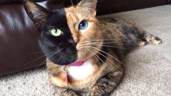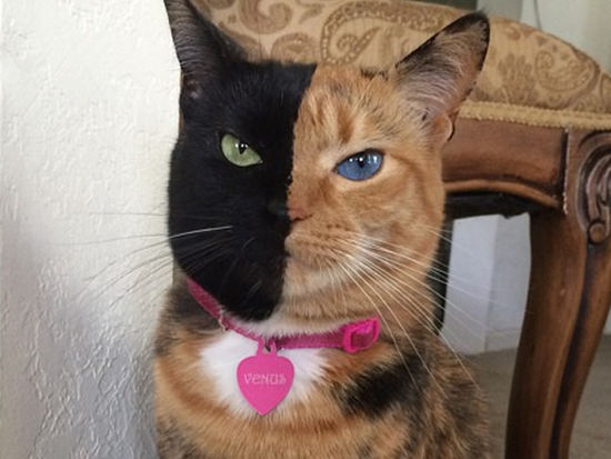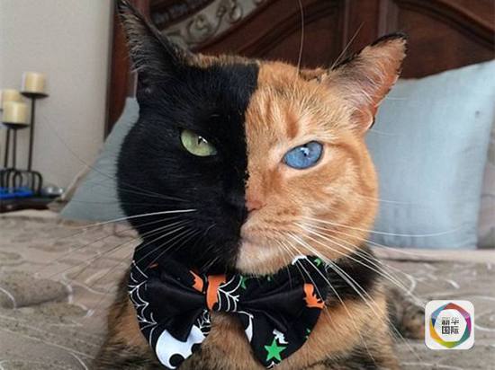 不爽貓、憤怒貓、驚訝貓、斗眼貓,現(xiàn)在又來(lái)了“分裂貓”?!∵@只5歲的貓名叫“維納斯”,左臉為黃色,右臉為黑色,分界線正好位于臉中央。不止如此,它的眼睛和胡須顏色也不一樣,黑臉一側(cè)的眼睛是綠的,胡須是黑的;黃臉一側(cè)是藍(lán)眼睛、白胡子。