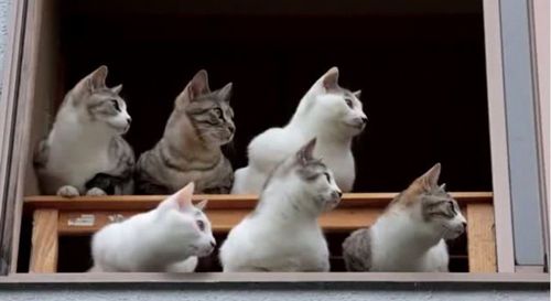 喵星人們一致往某個方向看過去的動作非常整齊。